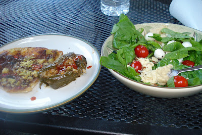 BUUUT it consisted of grilled salmon, a grape leaf with hot sauce, a fig and a salad with tomatoes, blue cheese, almond slivers and hummus.